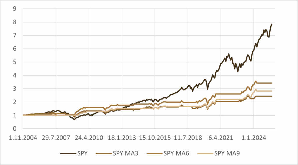 Strategies based on both approaches were tested, but N-month maxima performed relatively poorly. This appears to be because maxima primarily capture trends rather than short-term deviations, which are the focus of our predictive efforts. By the time a local maximum is reached, the opportunity for early signal detection is already partially lost. In contrast, comparing the current value to the N-month moving average allows us to identify significant deviations from the trend, effectively capturing unusual movements relative to the expected level. From a broader perspective, this makes sense, as smoothing the series provides a clearer view of the underlying dynamics. Based on these considerations, we adopt the moving-average-based approach as the foundation for the strategies presented in this article.
