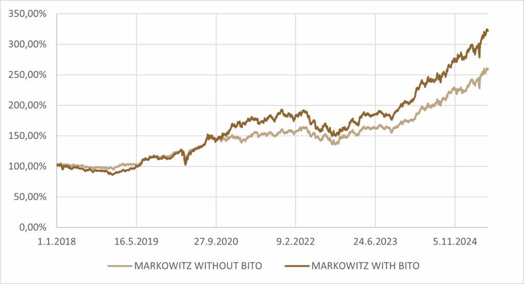 | Markowitz optimal without BITO | 13.69% | 12.40% | 1.10 |