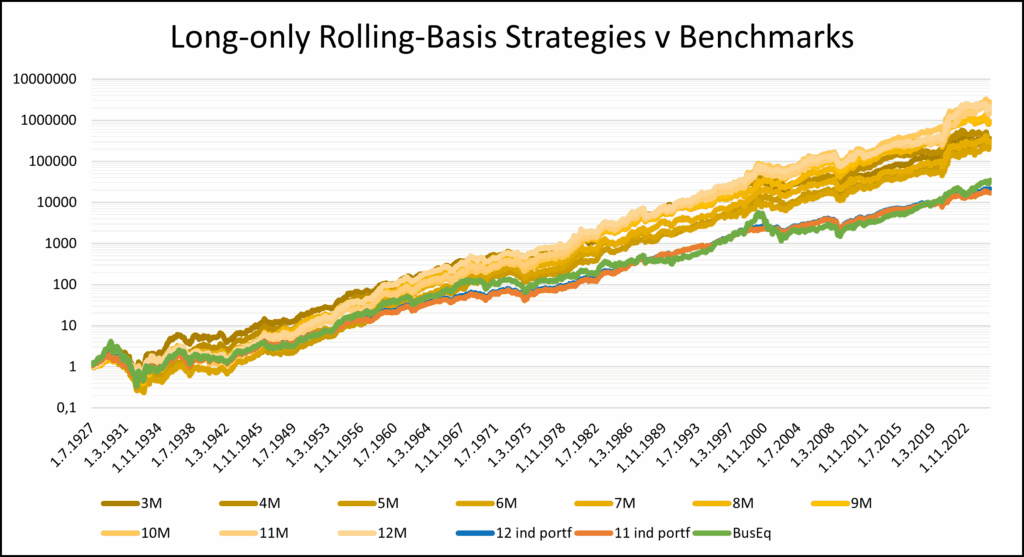 Figure 7: Performance of the long-only rolling-basis strategy with varying lookback periods from 3 to 12 months, compared to the 3 benchmarks, from July 1926 to June 2025.