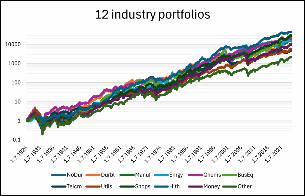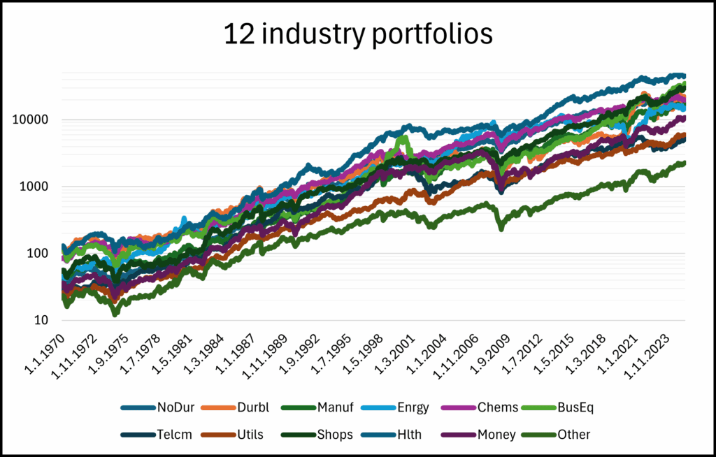 Figure 2: Performance of the 3 benchmarks — the average of all 12 industry portfolios, the average of 11 industry portfolios excluding the technology sector, and the technology sector alone in logarithmic scale, from July 1926 to June 2025, zoomed in on the period starting in January 1970.