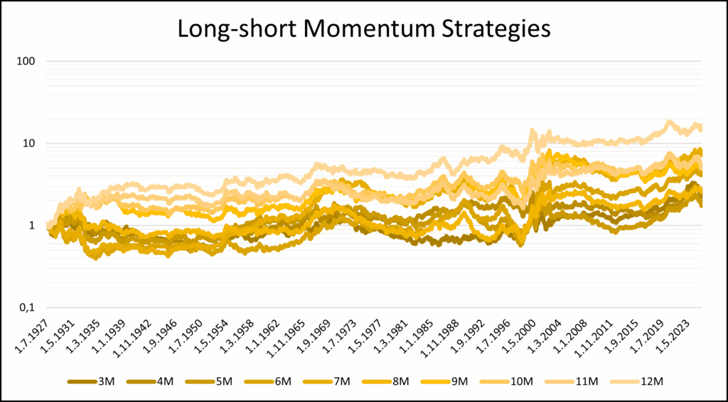 In this case, we also tested a long–short approach. Each month, we again compared the momentum of all portfolios, but this time we went long in the best-performing industry and short in the remaining ones with equal weights for the following month. We apply this approach primarily to observe the alpha, that is, the portion of performance attributable to strategy, rather than market movements. Again, we repeated this process each month, but this time we extended the momentum window, analyzing periods ranging from 1 month to 12 months. Again, graphical interpretation is in logarithmic scale.