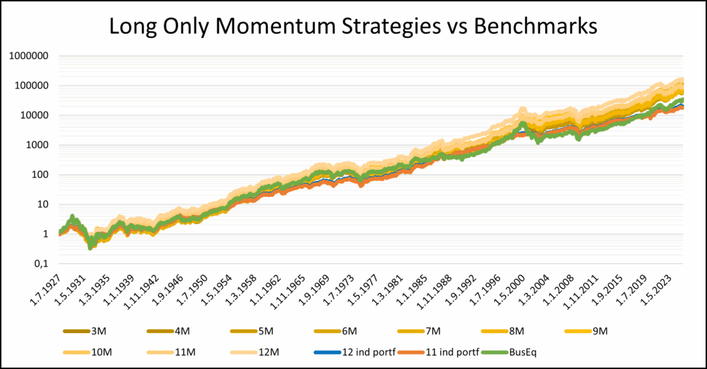 Figure 5: Performance of the long-only momentum strategy with varying lookback periods from 3 to 12 months, compared to the 3 benchmarks, from July 1926 to June 2025.