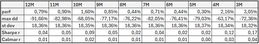 With this method, we can already observe a clear alpha, showing that longer horizons (8–12 months) are more effective than shorter ones in identifying the outperforming sector. In terms of performance and ratio metrics, the results don’t approach the benchmarks; however, we didn’t expect that, as all strategies are based on long-short and therefore all of the metrics are usually lower than long-only variants.