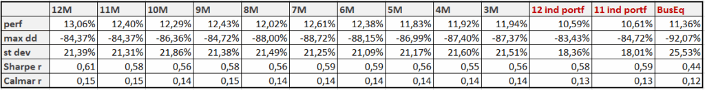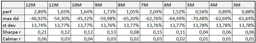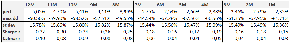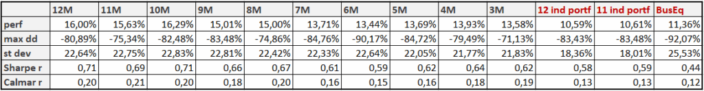 The last tested strategy is very similar, but instead of focusing on the maximum, we look at the 12-month moving average. If, in the current month, the value of the “average mom” equity curve is above its 12-month moving average, we invest in the “average mom” strategy for the following month. Otherwise, we stay out of the market, repeating this process each month. We label this strategy “12M Mom MA“.