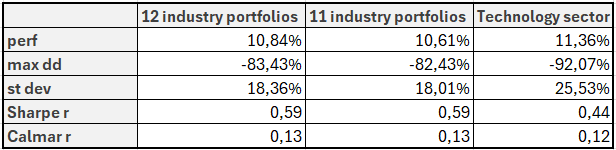 Table 1: Basic performance characteristics of the 3 benchmarks — the average of all 12 industry portfolios, the average of 11 industry portfolios excluding the technology sector, and the technology sector alone, from July 1926 to June 2025.