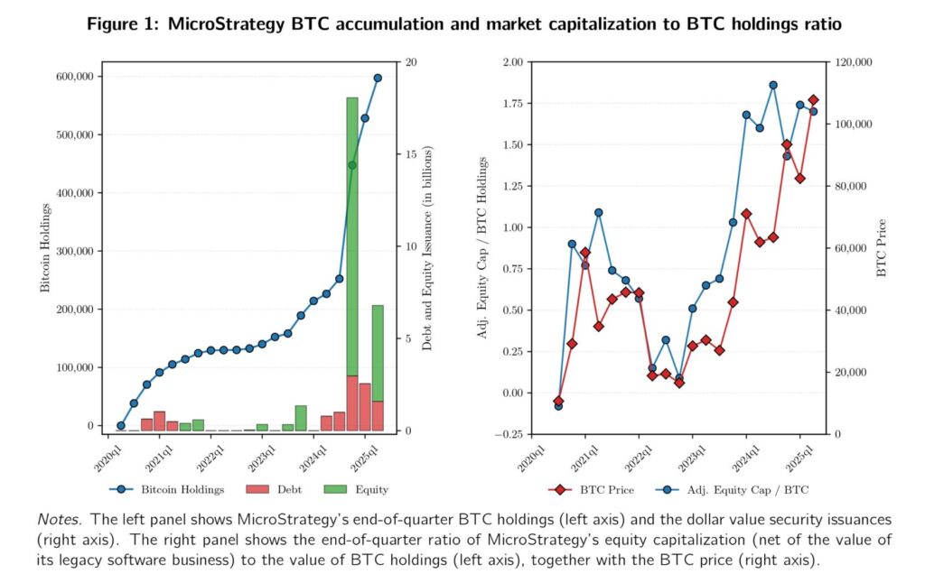 “MicroStrategy’s business model presents an unusual situation in corporate finance for two reasons. First, unlike regular businesses, the market value of the firm’s assets is observable: the quantity of BTC held multiplied by BTC’s price. Second, in blatant violation of Modigliani-Miller propositions, MicroStrategy’s equity market capitalization can be significantly higher than the market value of its assets. For example, at the end of 2025Q2, the market value of BTC holdings was $64.4 billion and the firm had over $10 billion of outstanding debt, while its equity market capitalization was $110.5 billion.1 This 50+ billion gap would be a contender for the largest mispricing across a pair of securities ever documented.