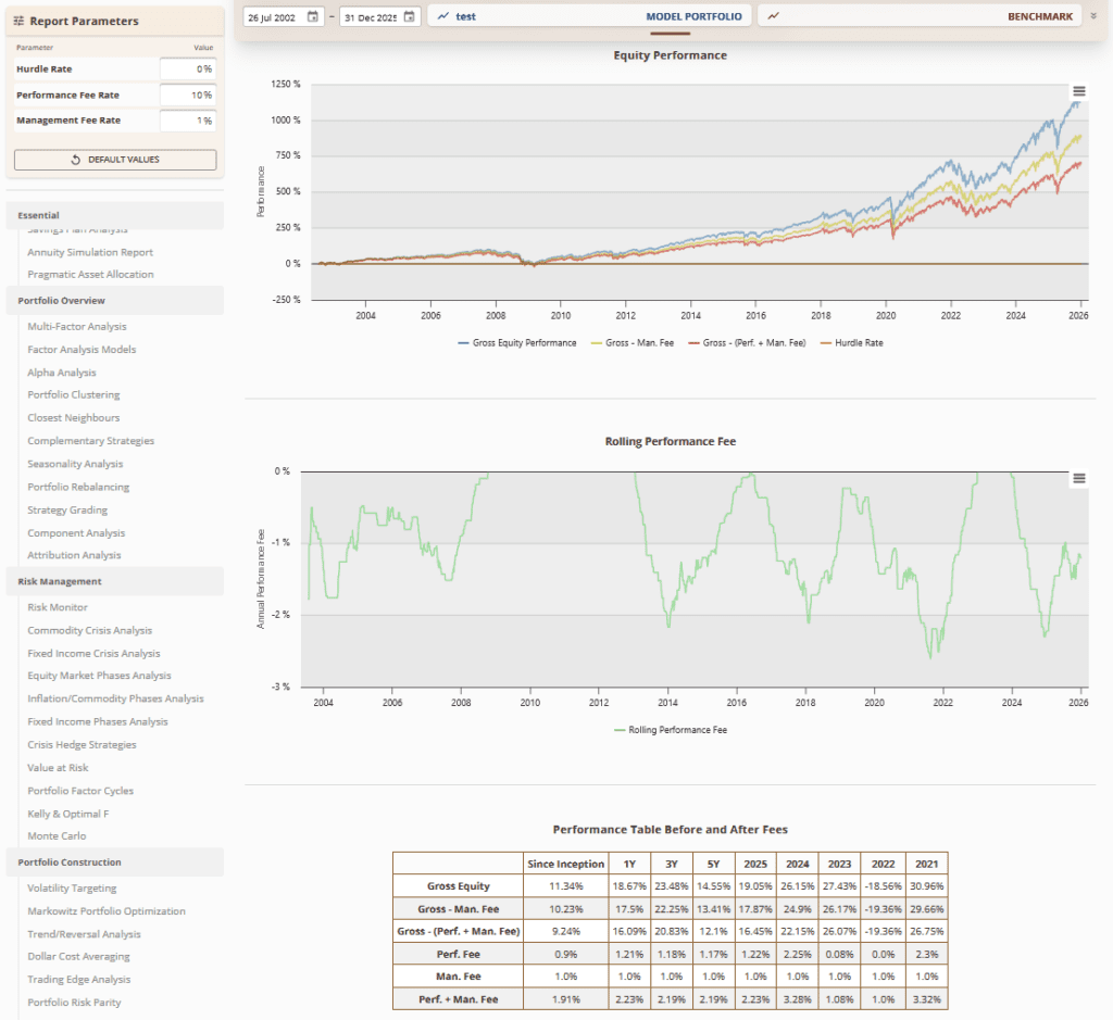 Firstly, let’s touch on the December addition among Quantpedia Pro reports – a new Fee Impact & Net Performance Analysis module that enables users to model and simulate management fees, performance fees, and hurdle rates directly on top of their model portfolios. This enhancement allows portfolio designers and fund managers to seamlessly transition from gross to net performance, visualize the fee-adjusted equity curve, and clearly quantify the long-term impact of fees across multiple horizons (since inception, rolling periods, and calendar years). By automating fee calculations and presenting them in a transparent, comparable format, the report significantly reduces the time and complexity involved in structuring, stress-testing, and validating new investment products—making it substantially easier to design realistic, investor-ready strategies and fund solutions.