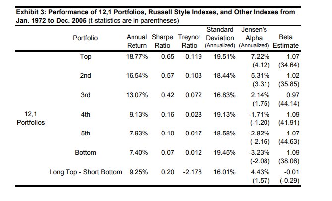 Russell’s ETFs for six equity styles are used (small-cap value, mid-cap value, large-cap value, small-cap growth, mid-cap growth, large-cap growth). Each month, the investor calculates 12-month momentum for each style and goes long on the winner and short on the loser. The portfolio is rebalanced each month.