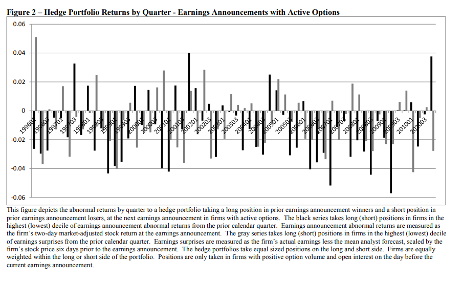 The investment universe consists of all stocks from NYSE, AMEX, and NASDAQ with active options market (so mostly large-cap stocks). Each day investor selects stocks which would have earnings announcement during the next working day. He then checks the abnormal performance of these stocks during the previous earnings announcement. Investor goes long decile of stocks with the lowest abnormal past earnings announcement performance and goes short stocks with the highest abnormal past performance. Stocks are held for two days, and the portfolio is weighted equally.