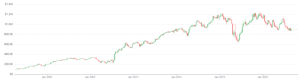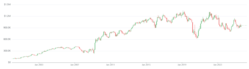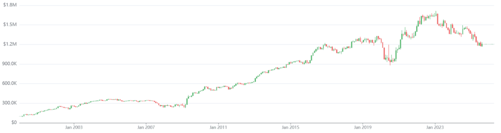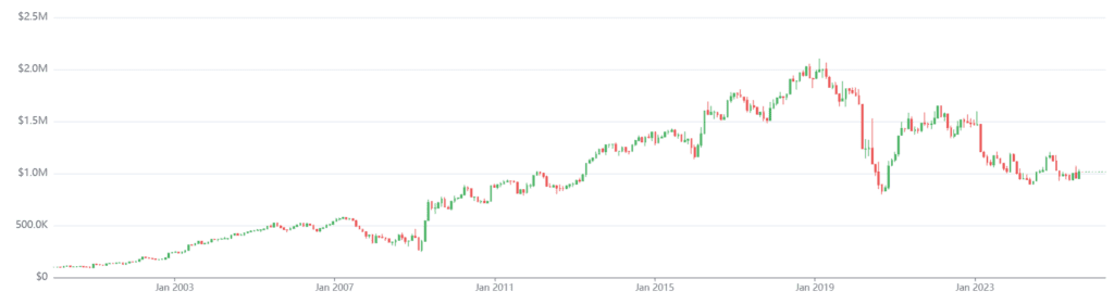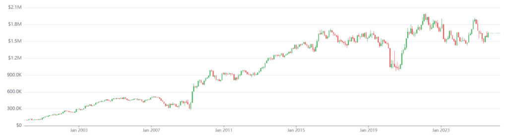 However, when adjusting for risk, the improvement is less pronounced. The Sharpe ratio remains in the vicinity of 0.4, which is broadly consistent with the other portfolio configurations (0.3 – 0.4). This suggests that while certain allocation choices may enhance raw returns, they do not meaningfully improve the risk-adjusted efficiency of the strategy.